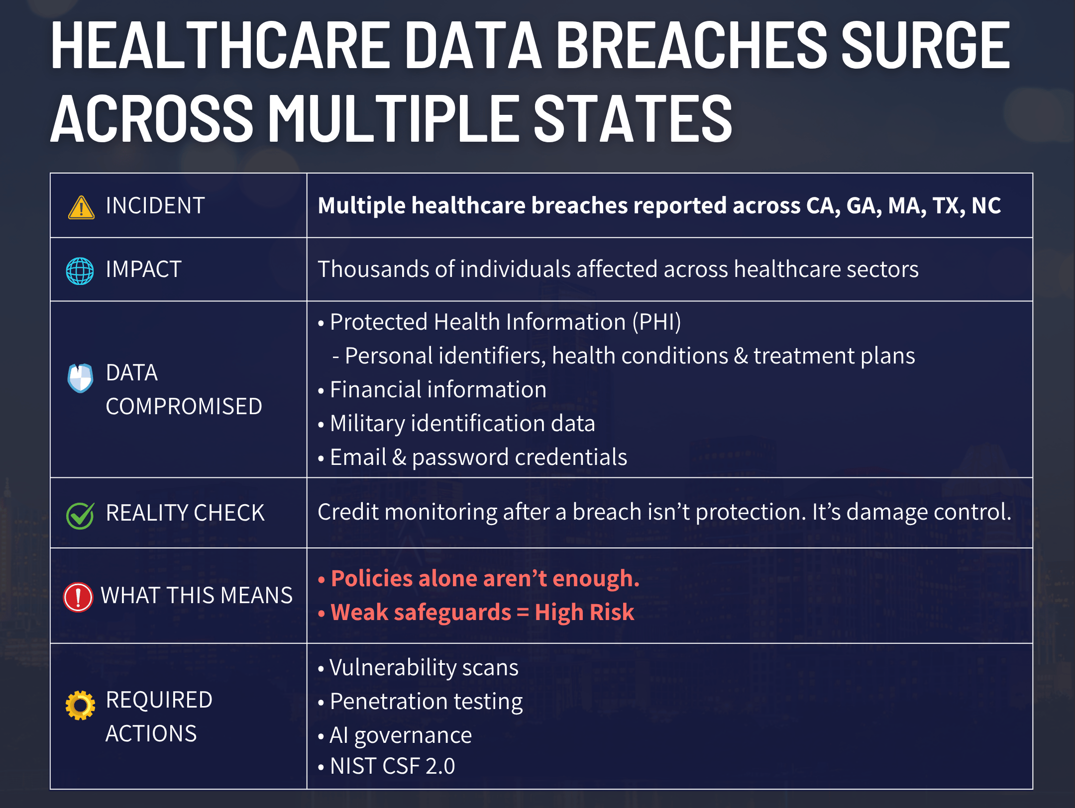 The federal government put out alerts earlier this year about the growing number of system and data breaches for 2026 and the healthcare and financial industries are top targets. Those alerts are rapidly becoming reality and for those impacted, the impacts are real and real serious.
