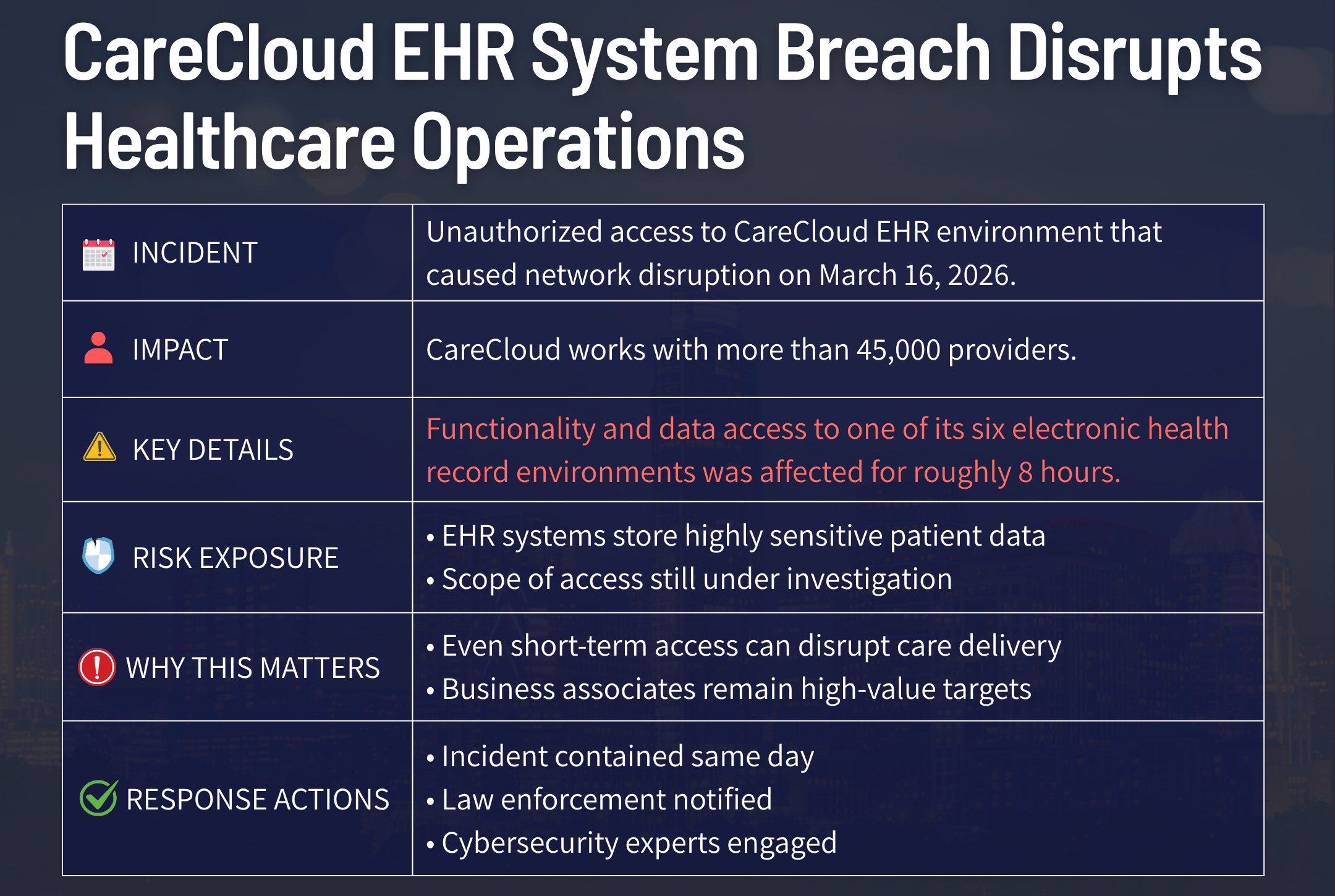 A cyber incident at CareCloud led to unauthorized access to one of its electronic health record (EHR) environments for approximately 8 hours, causing system disruption and limited data access.